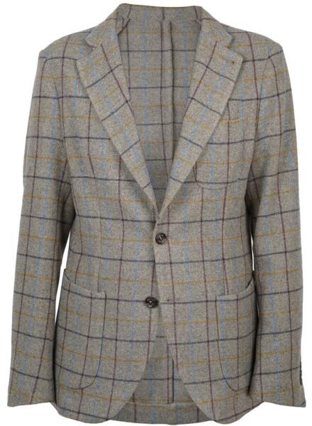 Olasz Royal Row London kabát világosszürke színben, többszínű csíkokkal, gyapjúkeverékből. Bélés nélküli és felsőrész nélküli, kétgombos patenttal, egy mellkasi és két oldalsó zsebbel, valamint enyhén rövidített, rövidebb szabással rendelkezik. Egy limitált szezonális kollekció része.